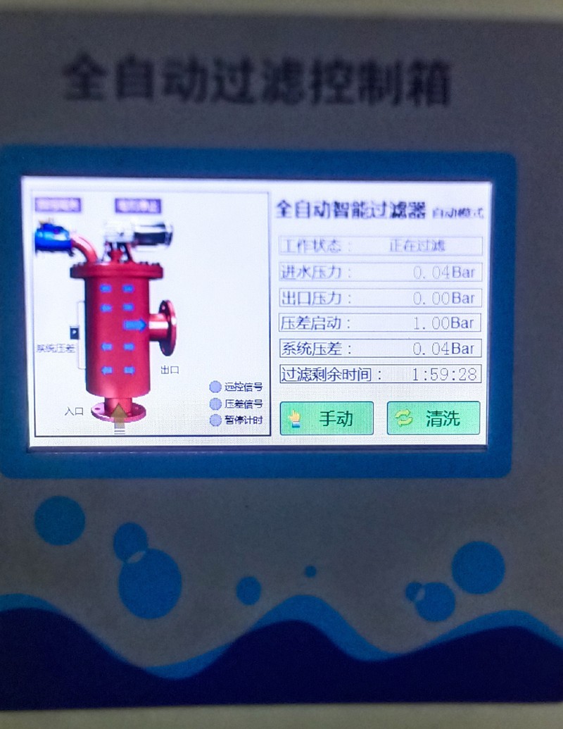 自動(dòng)控制:自動(dòng)控制有定時(shí)和壓差兩個(gè)方式。在過(guò)濾時(shí)間定時(shí)器上設(shè)定過(guò)濾時(shí)間,當(dāng)過(guò)濾時(shí)間到,啟動(dòng)排污,排污時(shí)間由排污時(shí)間定時(shí)器設(shè)定;同時(shí)控制系統(tǒng)實(shí)時(shí)將系統(tǒng)壓差與用戶設(shè)定的壓差相比較,當(dāng)系統(tǒng)壓差達(dá)到設(shè)定壓差時(shí),過(guò)濾器也進(jìn)行清洗排污,排污時(shí)間由排污時(shí)間定時(shí)器設(shè)定。排污時(shí)間到,停止清洗,系統(tǒng)恢復(fù)至其初始狀態(tài),為下一個(gè)過(guò)濾工序作好準(zhǔn)備。